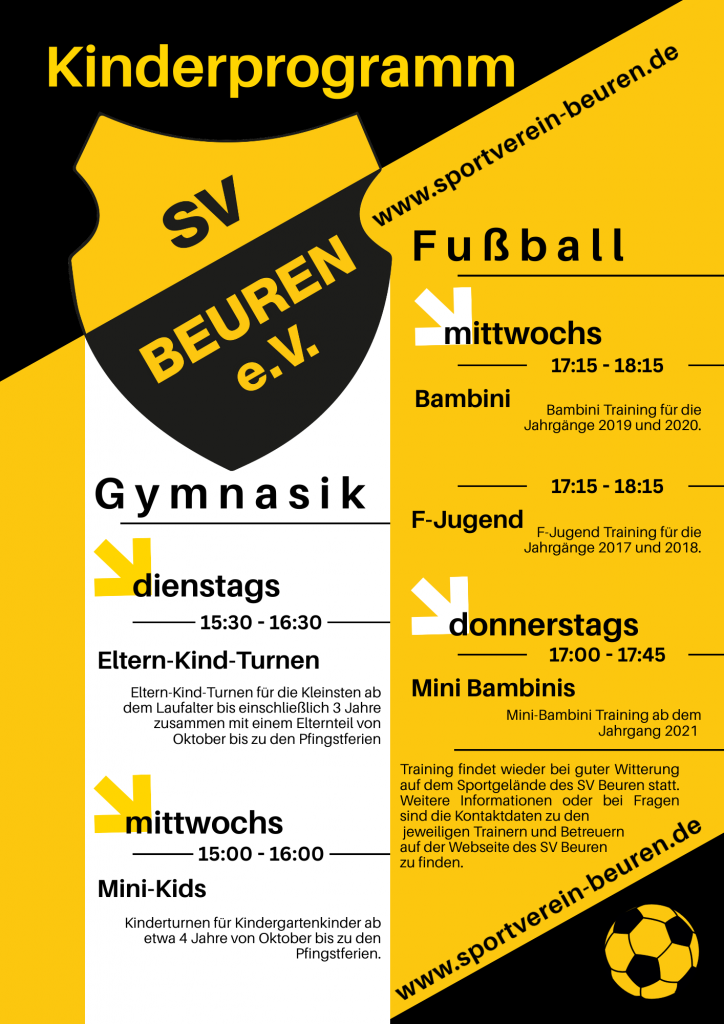 Das Kinderprogramm für das Frühjahr steht. Für die Kleinsten bieten wir das größte Programm. Unser Angebot der Abteilungen Gymnastik und der Jugendabteilung des SV Beuren könnt ihr unserem Flyer entnehmen.